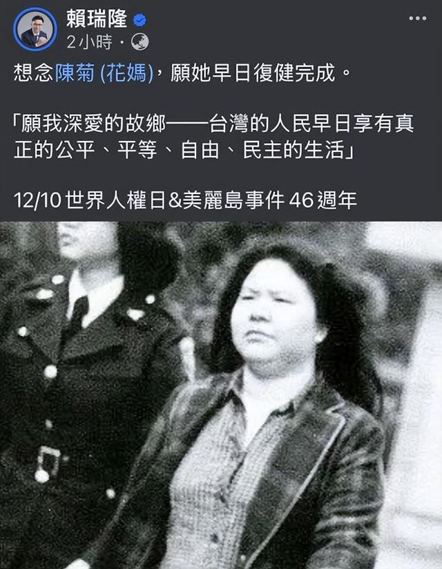 不过,赖瑞隆10日上午在脸书贴出陈菊黑白照并标注“想念花妈”,引起争议。有网友留言“一路好走”“还以为公祭呢”,后续又引起许多博主开酸。赖瑞隆3小时内就紧急下架发文,但还是被讽“想念陈菊只有3小时”等。